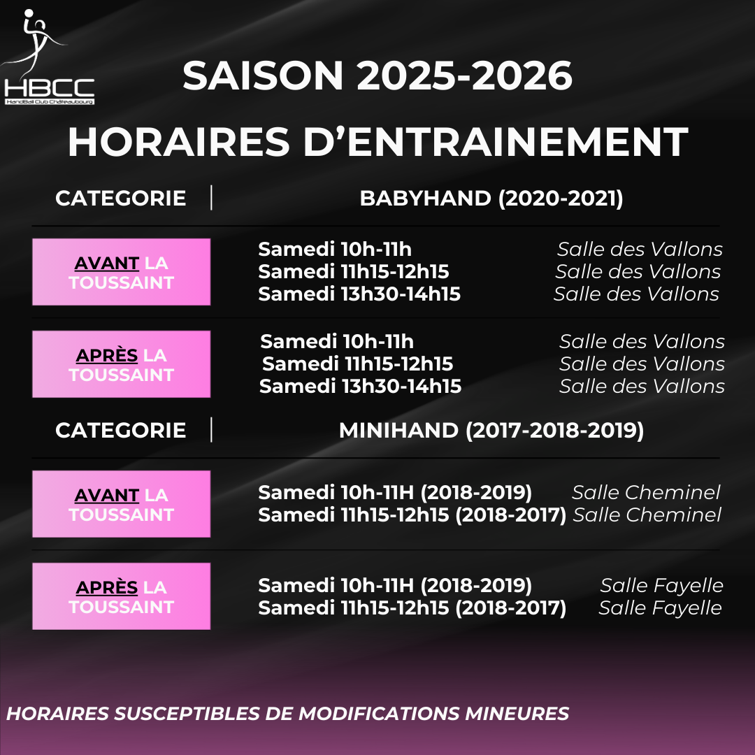 Concernant les entraînements des baby et minihand, ceux-ci reprendront à partir du 13 septembre.