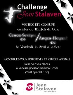 Après Chambéry et en attendant Dijon (le 30 avril), le club de Cesson organise la 1ère édition du Trophée Jean Stalaven et vous propose un match de gala le vendredi 16 avril à 20h30 au Palais des Sports. Au programme CESSON/ANGERS (D2). VENEZ EN GROUPE ASSISTER AU MATCH! Tarif exceptionnel : 3€.